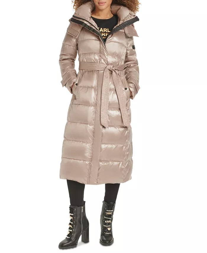 Karl Lagerfeld Paris Women's Belted Hooded Down Puffer Coat