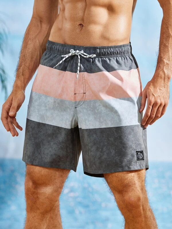 Men Color Block Letter Patched Detail Drawstring Waist Swim Trunks