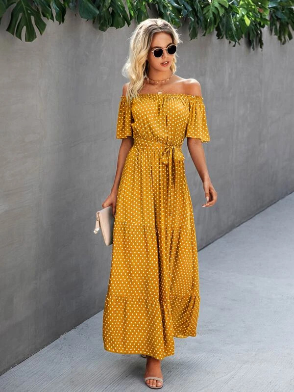 SEN Polka Dot Off the Shoulder Belted Dress