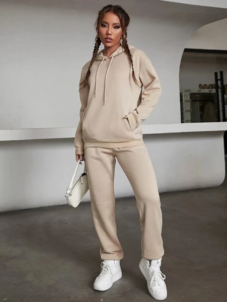 SEN Solid Drawstring Detail Thermal Lined Sweatshirt & Sweatpants