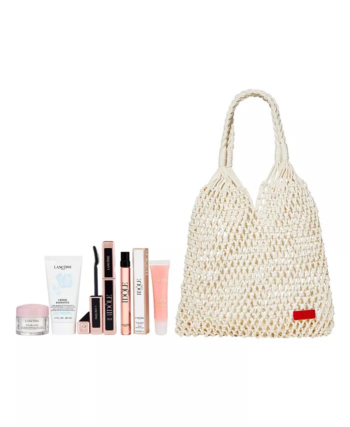 Get ready for warm weather and summer vacation with Lancôme's Beach Day Essentials Kit! This kit has everything you need for a day in the summer sun: Lash Idôle Waterproof Mascara, Juicy Tubes, for a pop of color; Hydra Zen Gel Cream, perfect for replenishing your skin after a day in the sun; a travel ready Idôle fragrance; and a cleanser to wash the day off. Your kit comes in a crochet beach bag that can hold all your essentials on the go wherever your adventures take you. It is perfect to throw in your suitcase for summer trips and transitions perfectly from day to night. $49 with any Lancôme purchase, a total gift value of $116!